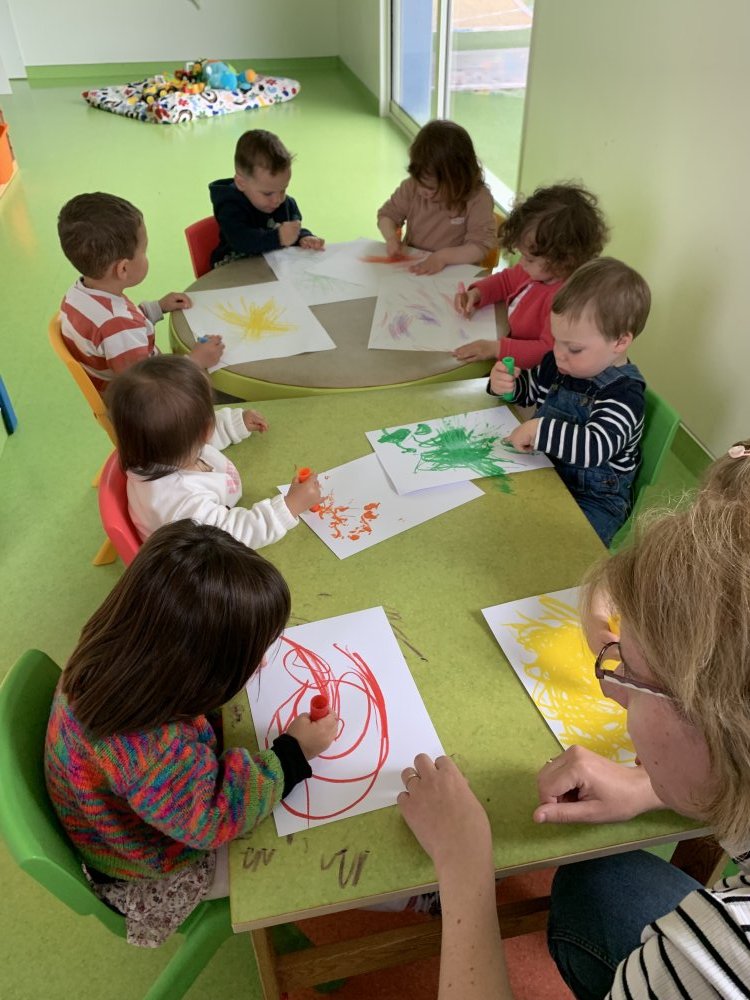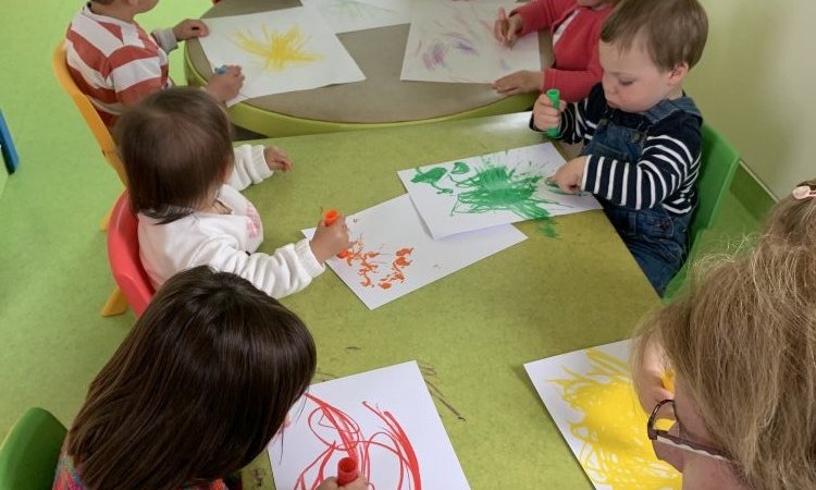 Magalie fait de la peinture propre avec Laëlia, Charlie, Léandre et Naussica pour réaliser un potager.