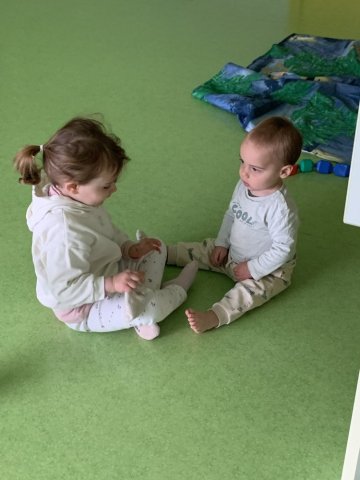 À la crèche, c'est adorable de voir les plus grands s'occuper des petits. Aujourd'hui, Elia est aux petits soins pour Elio. Elle s'applique, avec une patience infinie, à remettre sa chaussette.